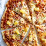 This Hawaiian Pizza recipe combines a crispy pizza dough base topped with savory ham, sweet pineapple, crispy bacon, and melted mozzarella cheese. The crust is brushed with a flavorful garlic butter Parmesan mixture and finished with a sprinkle of red pepper flakes and herbs, delivering a perfect balance of sweet and savory in every bite.