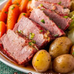 - Slice and Serve: Trim excess fat from the corned beef’s fat layer if desired. Slice the corned beef against the grain and place it on a serving platter. Drizzle with some cooking liquid.