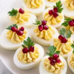 - Garnish and Serve: Top each deviled egg with one parsley stem and 2-3 pomegranate seeds. Serve immediately or refrigerate until ready to serve.
