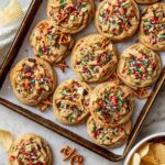 Kitchen Sink Cookies are a delightful mix of sweet and salty with a variety of textures and flavors, featuring chocolate chips, toffee bits, crunchy potato chips, pretzels, and festive holiday jimmies all baked into thick, chewy cookies.