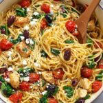 This Mediterranean Pasta One Pot recipe combines tender chicken breast with a creamy, flavorful sauce, fresh baby spinach, cherry tomatoes, kalamata olives, and feta cheese. Cooked all in one skillet, this easy dish is perfect for a quick weeknight meal packed with vibrant Mediterranean flavors.