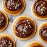 - Melt Milk Chocolate: In a microwave-safe bowl, melt milk chocolate in 30-second increments, stirring until smooth. Spoon chocolate over the caramel layer on each cookie. Top with flaky sea salt and edible gold leaf if desired. Allow to cool until chocolate and caramel are set.