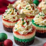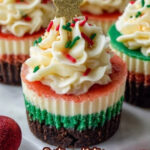 Delight in these festive Mini Christmas Cheesecakes featuring a rich Oreo cookie crust and a creamy, marbled cream cheese batter with red and green swirls. Perfect for holiday celebrations, these individual cheesecakes are topped with whipped cream and colorful sprinkles for a joyful finish.