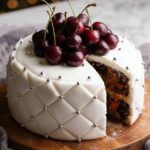 - Decorating (Optional): For traditional white Christmas cake decoration, roll out the marzipan and cover the cake, smoothing pleats with a wet knife. Then roll out and cover with white fondant. Create a quilted diamond pattern on the side using a blunt-edged tool, highlight intersections with silver balls, and top with cherries dusted lightly with icing sugar.