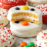 These Oreo Snowman Cookies are a fun and festive treat made by coating Double Stuf Golden Oreos with rich white chocolate and decorating them to look like adorable snowmen. Perfect for holiday parties or a creative winter dessert, these cookies feature eyes made from black sugar pearls, a nose from orange tic tacs, a smiling mouth with more sugar pearls, and colorful earmuffs crafted from sour punch straws and M&Ms. Easy to make and delightful to eat, they bring a cheerful touch to any celebration.