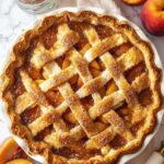 - Assemble the pie: Roll out one pie crust on parchment paper to fit a pie plate, then transfer it carefully to the plate preserving overhang. Spread peach filling evenly in crust and dot with small cubes of butter. Roll out second crust and place over filling using desired design (lattice or solid). Trim and shape crust edges using overhang from bottom crust. Brush crust with beaten egg and sprinkle coarse sugar on top.