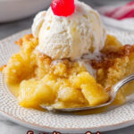 I always top my warm Pineapple Dump Cake with a big scoop of creamy vanilla ice cream and a bright red maraschino cherry. The cold ice cream melting over the warm cake is just dreamy and balances the sweetness perfectly.