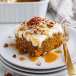 I love customizing this Pumpkin Poke Cake Recipe depending on the occasion. Sometimes I swap the caramel sauce for a homemade maple glaze or add dried cranberries in the batter for a little tartness. You can absolutely tweak it to fit your taste or dietary needs.