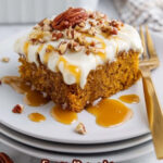 - Frost and Garnish: Spread 1 cup of cream cheese frosting evenly over the cake’s surface. Sprinkle the chopped pecans on top, then drizzle additional caramel sauce for extra sweetness and decoration.