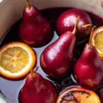 - Poach Pears: Heat the pot over medium-high until the liquid reaches a rolling boil. Lower the heat to a gentle simmer, then add the pears and the reserved orange juice. Cover and let simmer gently for 30 minutes, occasionally rotating pears with a wooden spoon. Pears are done when a skewer inserted in the thickest part meets no resistance.