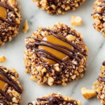 Delicious Salted Caramel Turtle Thumbprint Cookies featuring a rich cocoa cookie base coated with chopped pecans, filled with smooth salted caramel, and drizzled with melted chocolate. Perfectly balanced with a touch of flaky sea salt for a sweet and salty treat.