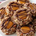 Delicious Salted Caramel Turtle Thumbprint Cookies featuring a rich cocoa cookie base coated with chopped pecans, filled with smooth salted caramel, and drizzled with melted chocolate. Perfectly balanced with a touch of flaky sea salt for a sweet and salty treat.
