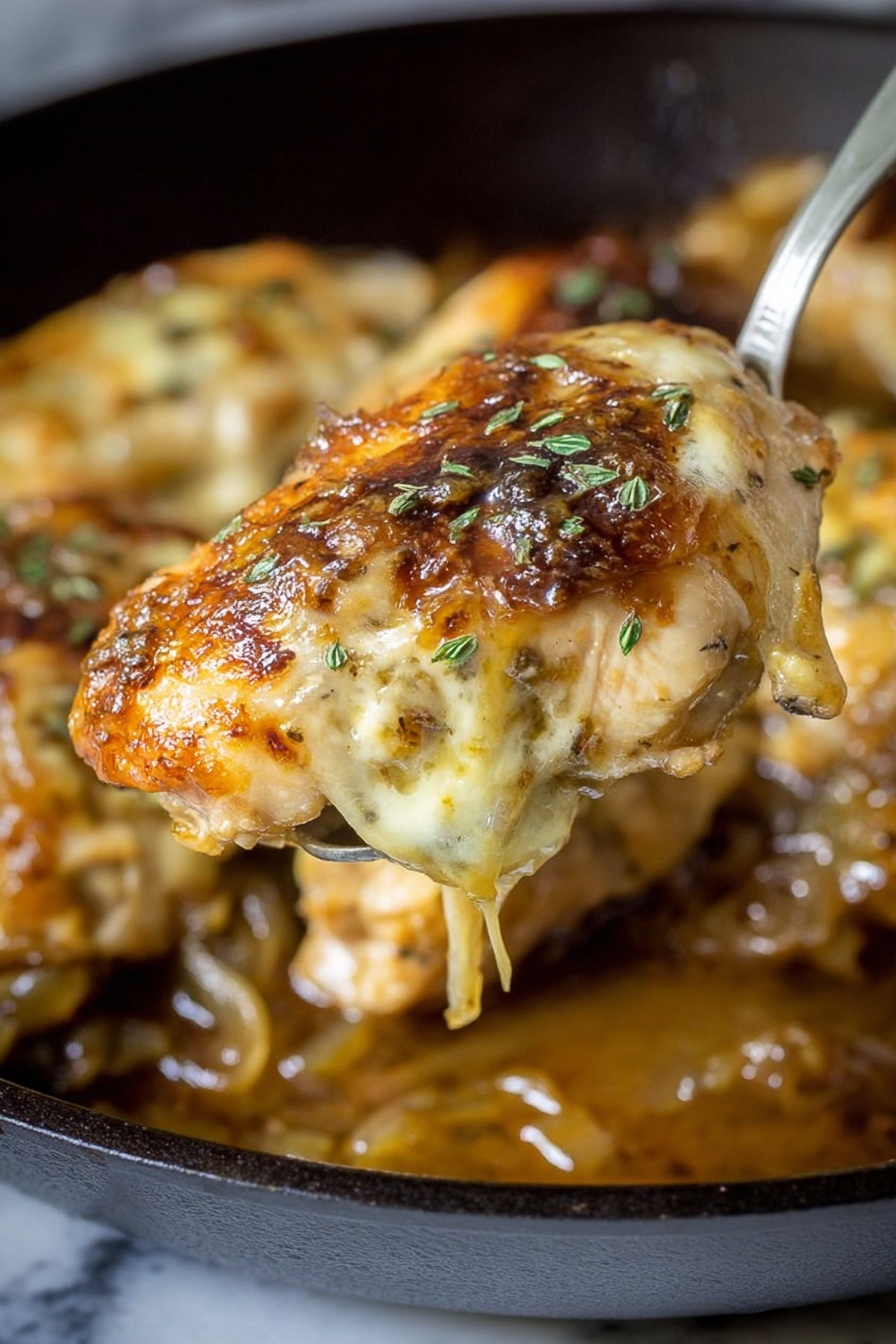 Skillet French Onion Chicken is a savory, comforting dish featuring tender chicken breasts topped with caramelized onions, rich thyme-infused gravy, and a melted cheese blend of Swiss and provolone. This easy-to-make meal combines classic French onion flavors with hearty chicken for a delicious dinner in just 30 minutes.
