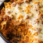 - Layer beef and cream mixture: Sprinkle half of the cooked ground beef over the sauce and pasta, followed by spreading all of the cream cheese mixture evenly on top.