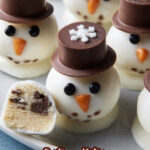 These Melted Snowman Cookie Dough Bites are a fun and festive no-bake treat featuring edible cookie dough balls dipped in white chocolate ganache, decorated with candy hats and sprinkles to resemble adorable snowmen. Perfect for holiday parties and winter celebrations.