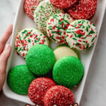 Sanding sugar, nonpareils, and jimmies all work beautifully. I like using multicolored sanding sugar for sparkle and a little crunch, but feel free to mix and match according to what you have or the holiday colors you prefer.