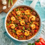 A classic Cajun Creole dish bursting with flavors from andouille sausage, tender chicken, fresh vegetables, aromatic spices, and succulent shrimp all cooked together with rice for a hearty and satisfying meal.