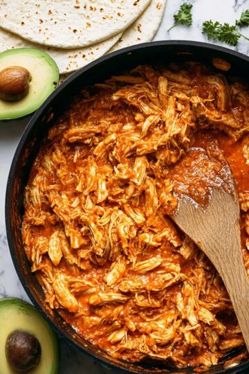 - Serve: Warm corn tortillas and serve the chicken tinga topped with cotija cheese, diced white onion, chopped cilantro, and diced avocado.