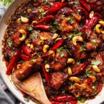 - Cook vegetables and cashews: Heat 1 tablespoon vegetable oil in a clean skillet over medium-high heat. Add 1 cup cashews, 1 thinly sliced red bell pepper, ½ thinly sliced red onion, and 3 dried red chilis. Stir frequently and cook for about 5 minutes until vegetables are tender.