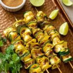 - Turn skewers gently to avoid breaking the delicate zucchini ribbons.
