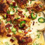 A creamy and spicy Jalapeño Popper Chicken recipe featuring tender chicken breasts smothered in a rich jalapeño cheese sauce topped with crispy bacon and green onions. Perfect for a flavorful dinner served with your favorite sides.