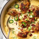 A creamy and spicy Jalapeño Popper Chicken recipe featuring tender chicken breasts smothered in a rich jalapeño cheese sauce topped with crispy bacon and green onions. Perfect for a flavorful dinner served with your favorite sides.