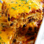 Taco Lasagna is a delicious fusion of traditional lasagna layered with bold, Tex-Mex flavors. This hearty casserole features layers of seasoned ground beef, black beans, enchilada sauce, salsa, ricotta cheese, and plenty of shredded cheddar, all baked to bubbly perfection. Perfect for a crowd or family dinner, it combines the comfort of Italian pasta with vibrant Mexican-inspired ingredients for a flavorful and satisfying meal.