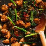 A quick and flavorful Thai Chilli Basil Chicken stir-fry featuring tender chicken thigh pieces cooked with aromatic Thai basil, garlic, and fiery birds eye chilli, tossed in a glossy, savory sauce served with steamed jasmine rice.