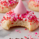 Delight in these Strawberry Kiss Cookies, featuring a soft funfetti sugar cookie base enriched with cream cheese and topped with iconic Hershey’s Strawberry Ice Cream Cone Kisses. Perfectly tender with a sweet, fruity finish, these cookies are rolled in colorful sanding sugar or non-pareils for a festive touch.