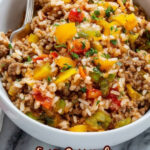 - Assemble the Casserole. In a baking dish, spread half of the meat mixture evenly. Layer with half of the cooked brown rice, diced bell peppers, diced onion, and half the shredded cheddar cheese. Repeat the layering once more with the remaining ingredients.
