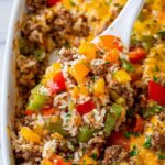 - Assemble the Casserole. In a baking dish, spread half of the meat mixture evenly. Layer with half of the cooked brown rice, diced bell peppers, diced onion, and half the shredded cheddar cheese. Repeat the layering once more with the remaining ingredients.