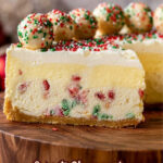 - Finish and Decorate: Remove chilled cheesecake from springform pan and parchment paper. Pour white chocolate ganache evenly over the top. Place cheesecake in freezer for 10 minutes to set ganache. Decorate with remaining cookie dough balls and additional Christmas sprinkles. Serve chilled.