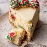 This sugar cookie cheesecake combines a buttery sugar cookie crust with festive sprinkles, creamy cheesecake studded with cookie dough balls, and a luscious white chocolate ganache topping. Perfect for holiday celebrations or anytime you crave a fun and indulgent dessert.