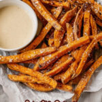 You can prep the sweet potatoes in advance by cutting and soaking them ahead of time, but it’s best to bake the fries and prepare the dip fresh just before serving to enjoy optimum crispiness and creamy dip texture.